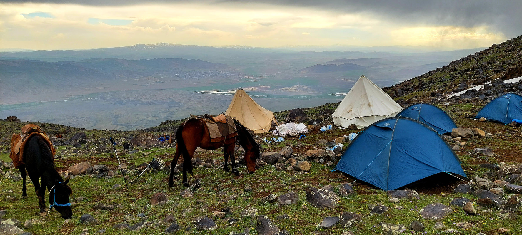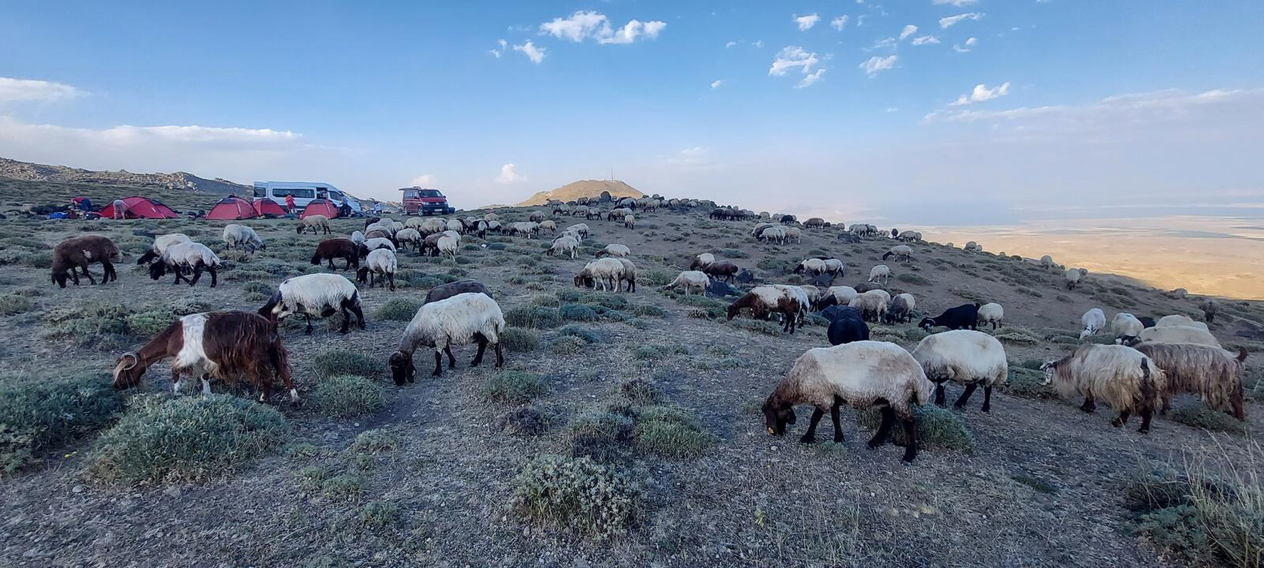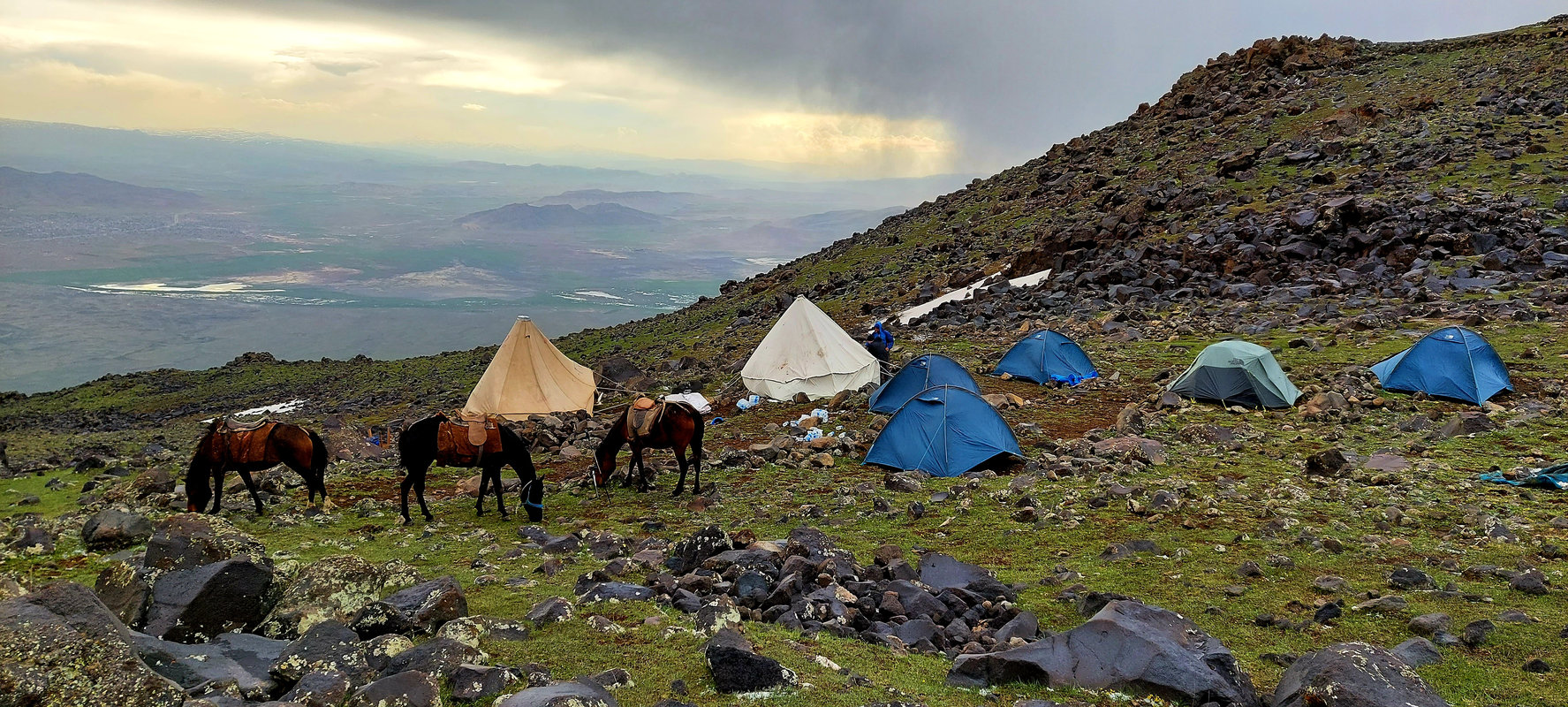 Po śniadaniu wyruszamy w kierunku Araratu, aby rozpocząć trekking do pierwszego obozu na wysokości 3 300 m. Klimat tutaj jest pustynny, a teren ukształtowany przez aktywność wulkaniczną. Wśród wysuszonej słońcem roślinności wypasają się owce pilnowane przez karabasze – anatolijskie psy pasterskie. Między nimi latają kolorowe dudki i sprytne kruki. Po raz pierwszy zobaczymy kurdyjskie chałupy, gdzie ludzie wiodą tradycyjne życie. Po dojechaniu do punktu zbiórki (2500m) bierzemy małe plecaki z niezbędnymi rzeczami – konie będą transportować ciężki bagaż. W drodze do obozu zobaczymy całą trasę, którą będziemy pokonywać przez kolejne dni, aż po szczyt pokryty czapą lodowcową. Trekking zajmie około 3-4 godzin. Po przybyciu do obozu czas na relaks, śpiewy i tańce przy kurdyjskiej muzyce oraz malowniczy zachód słońca.