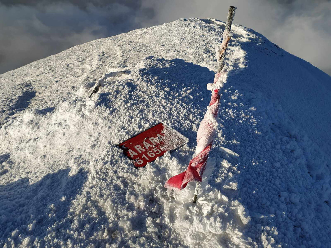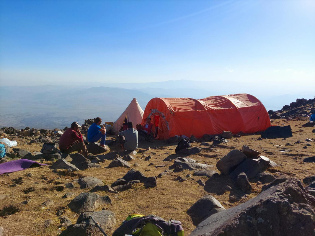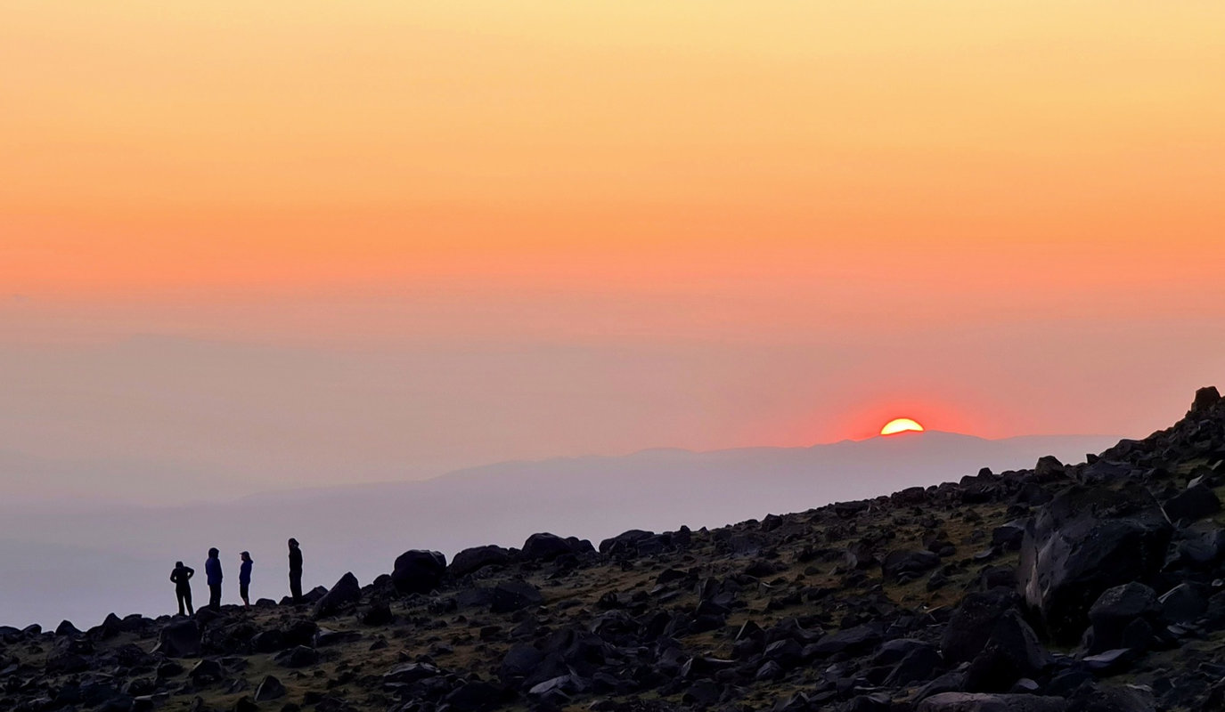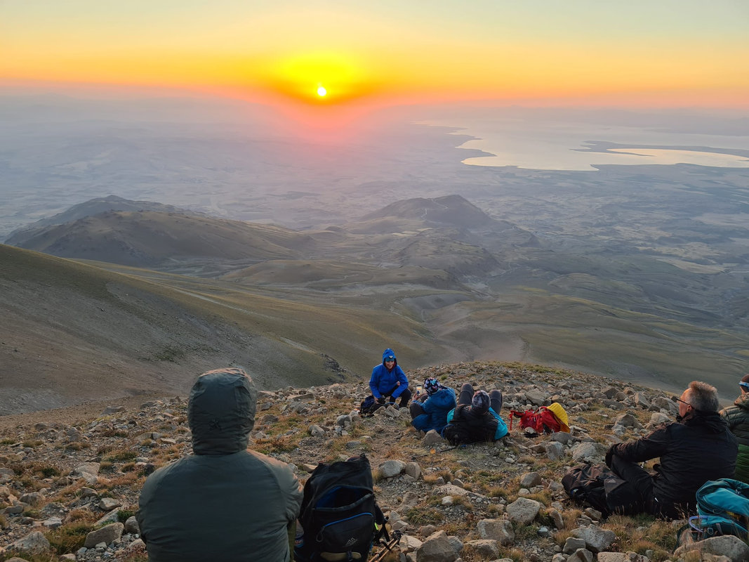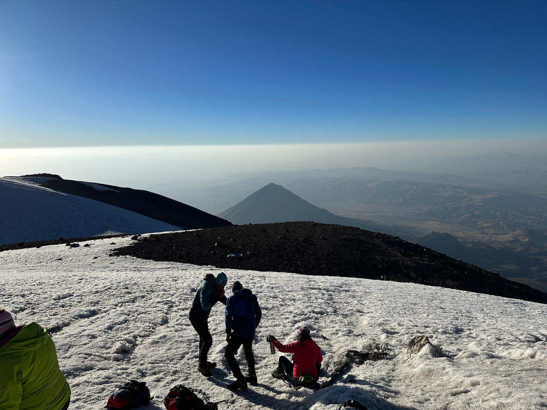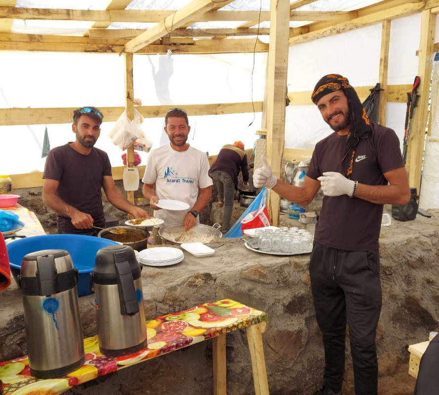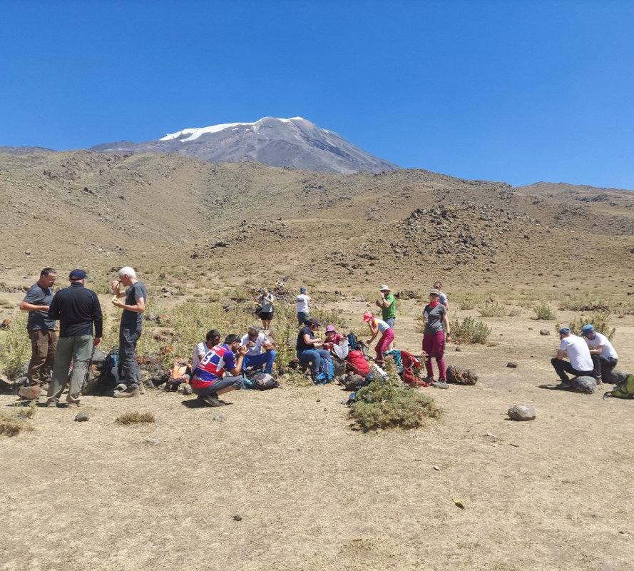 Dzień szczytowy! Wyruszamy po śniadaniu, uzupełniając zapasy wody i herbaty. Droga na szczyt zajmuje do 5 godzin i jest najtrudniejszym odcinkiem wyprawy. Od początku ścieżka jest wymagająca i dosyć stroma – mamy do pokonania około 500 m trudnego terenu, później robi się lżej. Wschód słońca przynosi bajeczne widoki: Mały Ararat i niesamowity cień Wielkiego Araratu. Sam szczyt pojawia się od wysokości około 4 700 m, co daje dodatkową motywację. Na Araracie jest lodowiec utrzymujący się cały rok – tutaj zakładamy raki. Z tego miejsca tylko 30-40 minut do szczytu, z którego rozpościerają się widoki na Iran, Armenię, Aragats oraz Tendurek – drugą świętą górę Kurdów. Po zdobyciu szczytu schodzimy z powrotem do obozu drugiego na odpoczynek i posiłek, a następnie kontynuujemy zejście do obozu pierwszego. Tam pierwsze świętowanie sukcesu!