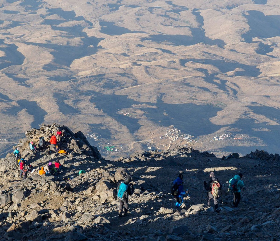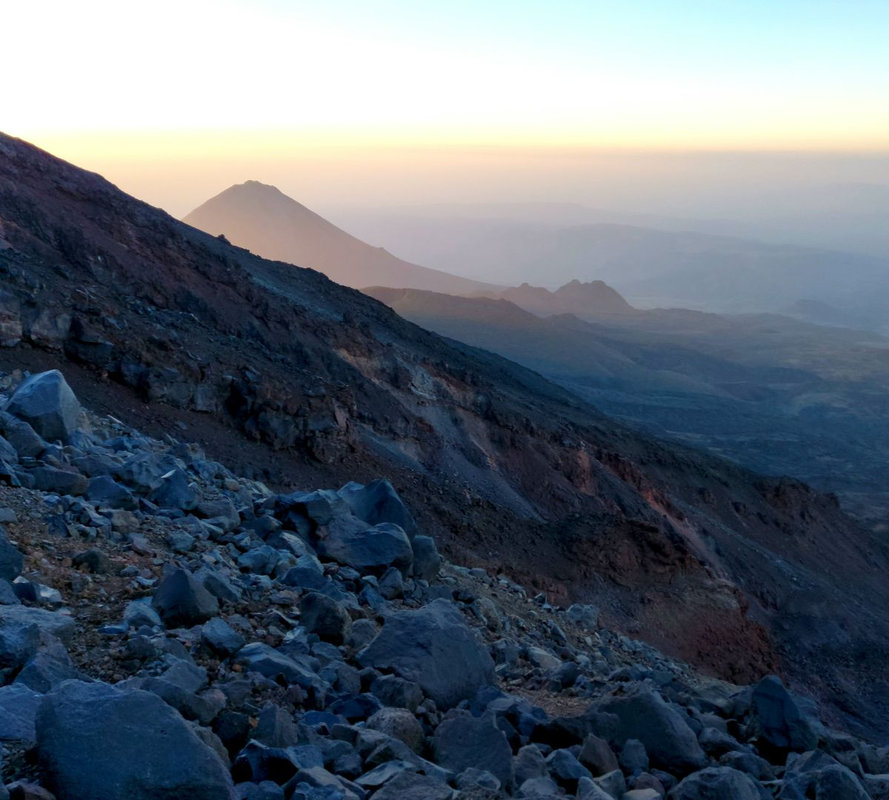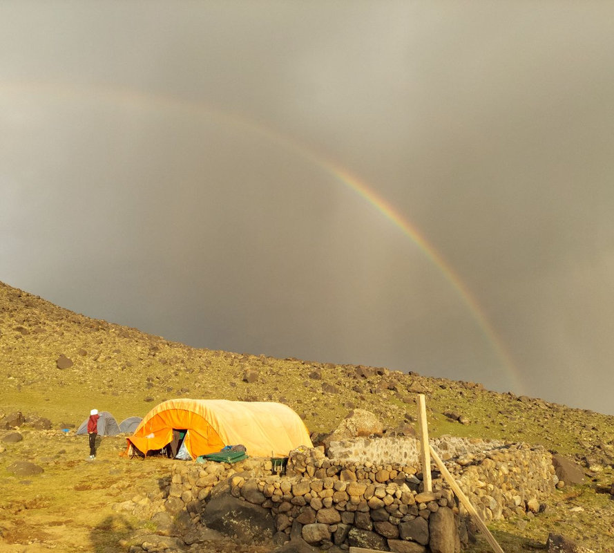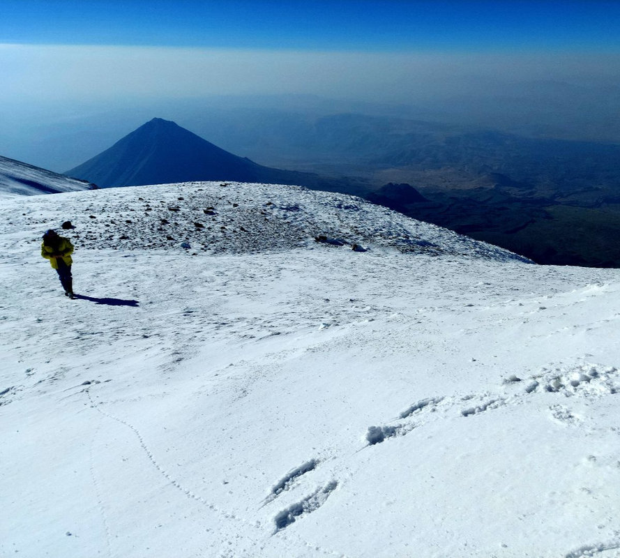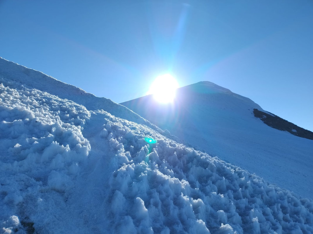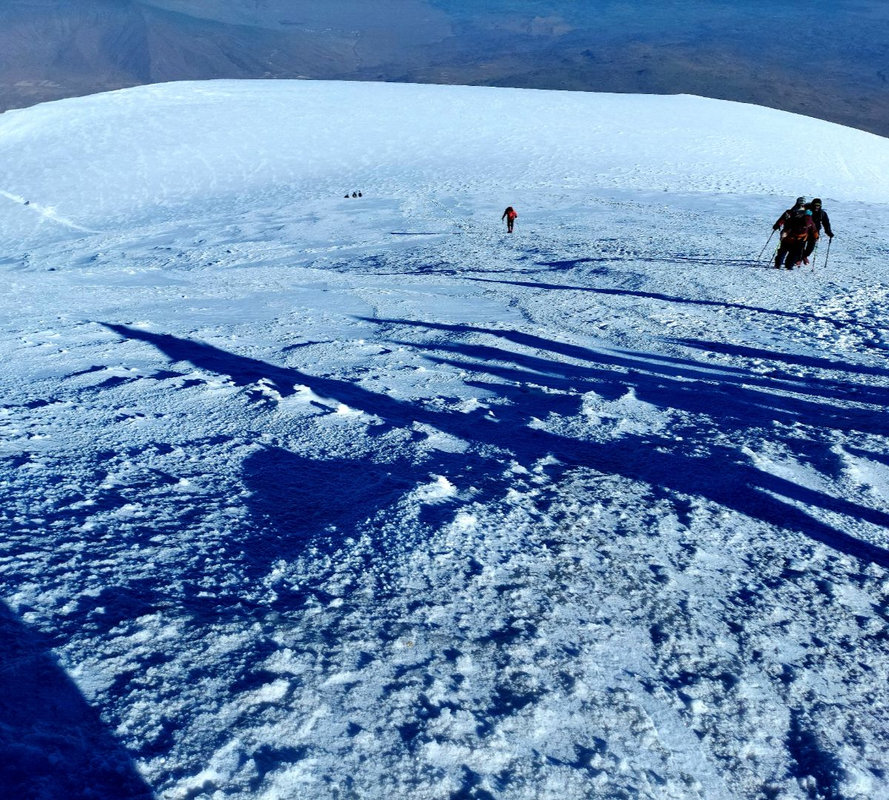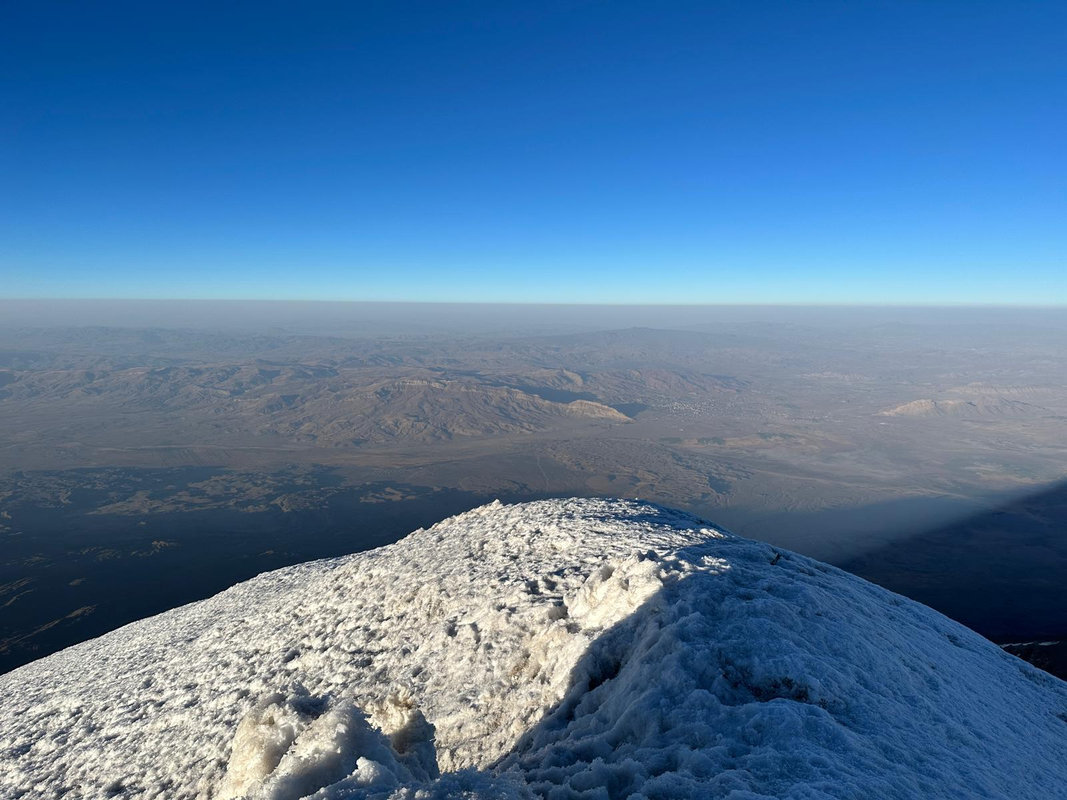 Dzień szczytowy! Wyruszamy po śniadaniu, uzupełniając zapasy wody i herbaty. Droga na szczyt zajmuje do 5 godzin i jest najtrudniejszym odcinkiem wyprawy. Od początku ścieżka jest wymagająca i dosyć stroma – mamy do pokonania około 500 m trudnego terenu, później robi się lżej. Wschód słońca przynosi bajeczne widoki: Mały Ararat i niesamowity cień Wielkiego Araratu. Sam szczyt pojawia się od wysokości około 4 700 m, co daje dodatkową motywację. Na Araracie jest lodowiec utrzymujący się cały rok – tutaj zakładamy raki. Z tego miejsca tylko 30-40 minut do szczytu, z którego rozpościerają się widoki na Iran, Armenię, Aragats oraz Tendurek – drugą świętą górę Kurdów. Po zdobyciu szczytu schodzimy z powrotem do obozu drugiego na odpoczynek i posiłek, a następnie kontynuujemy zejście do obozu pierwszego. Tam pierwsze świętowanie sukcesu!