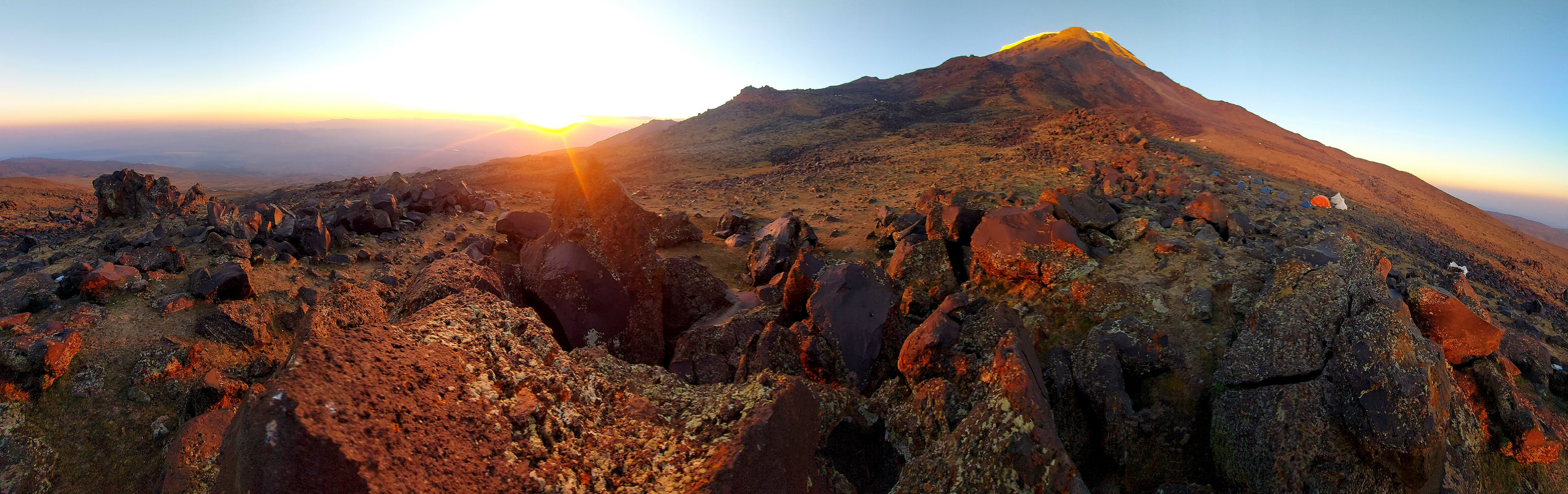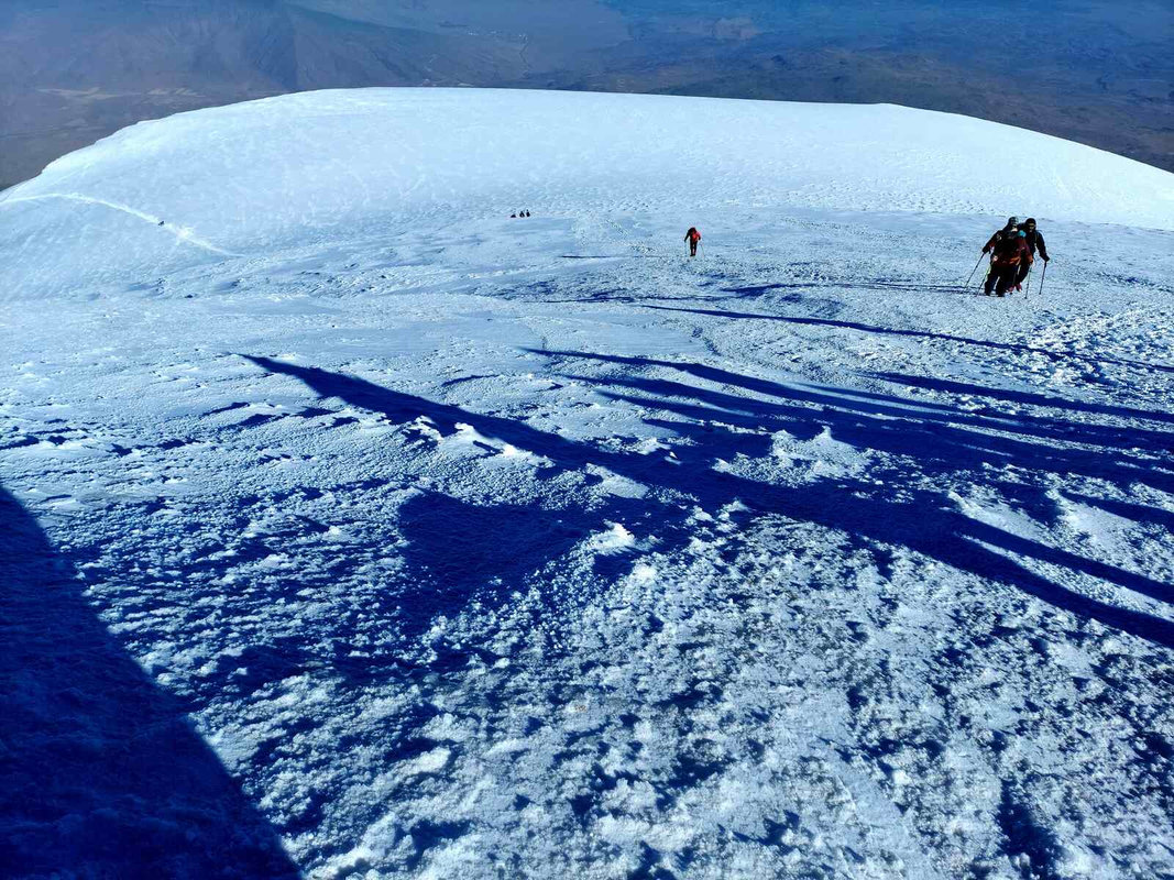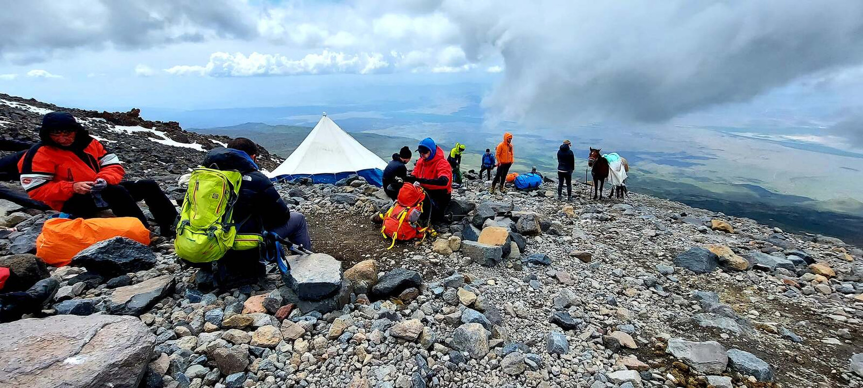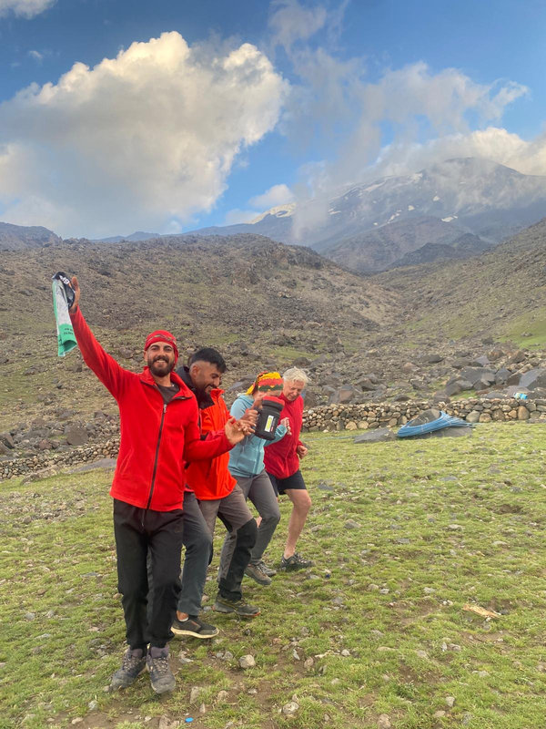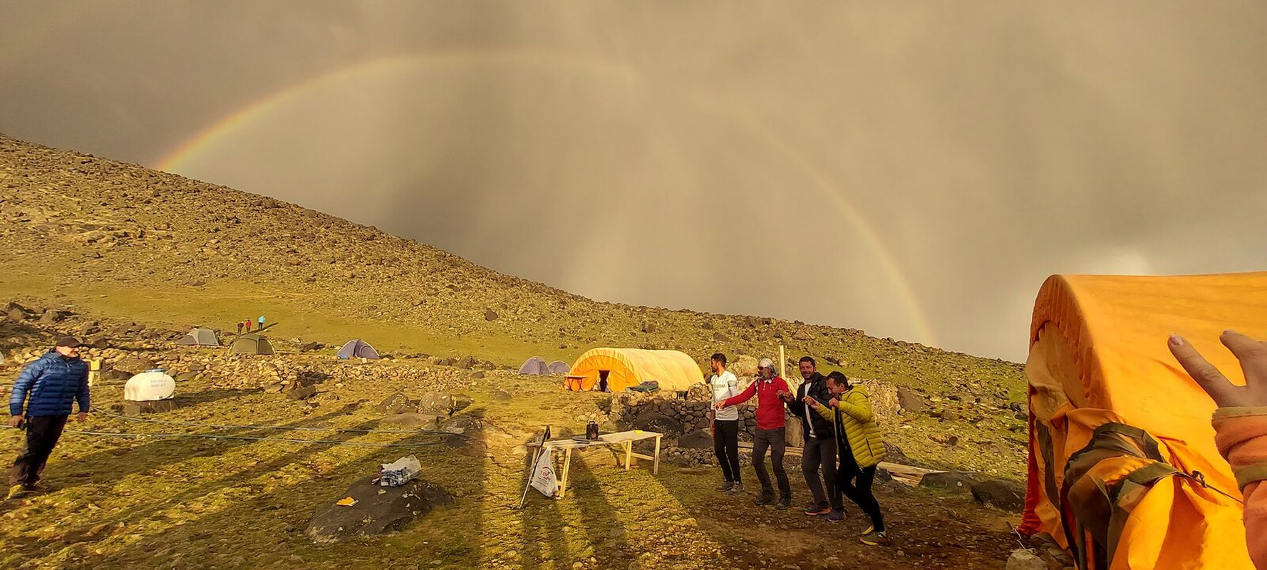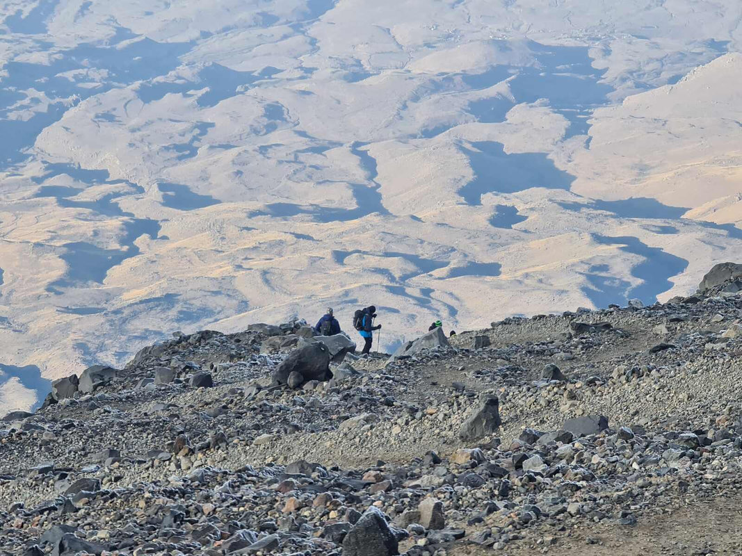 Dzień szczytowy! Wyruszamy po śniadaniu, uzupełniając zapasy wody i herbaty. Droga na szczyt zajmuje do 5 godzin i jest najtrudniejszym odcinkiem wyprawy. Od początku ścieżka jest wymagająca i dosyć stroma – mamy do pokonania około 500 m trudnego terenu, później robi się lżej. Wschód słońca przynosi bajeczne widoki: Mały Ararat i niesamowity cień Wielkiego Araratu. Sam szczyt pojawia się od wysokości około 4 700 m, co daje dodatkową motywację. Na Araracie jest lodowiec utrzymujący się cały rok – tutaj zakładamy raki. Z tego miejsca tylko 30-40 minut do szczytu, z którego rozpościerają się widoki na Iran, Armenię, Aragats oraz Tendurek – drugą świętą górę Kurdów. Po zdobyciu szczytu schodzimy z powrotem do obozu drugiego na odpoczynek i posiłek, a następnie kontynuujemy zejście do obozu pierwszego. Tam pierwsze świętowanie sukcesu!
